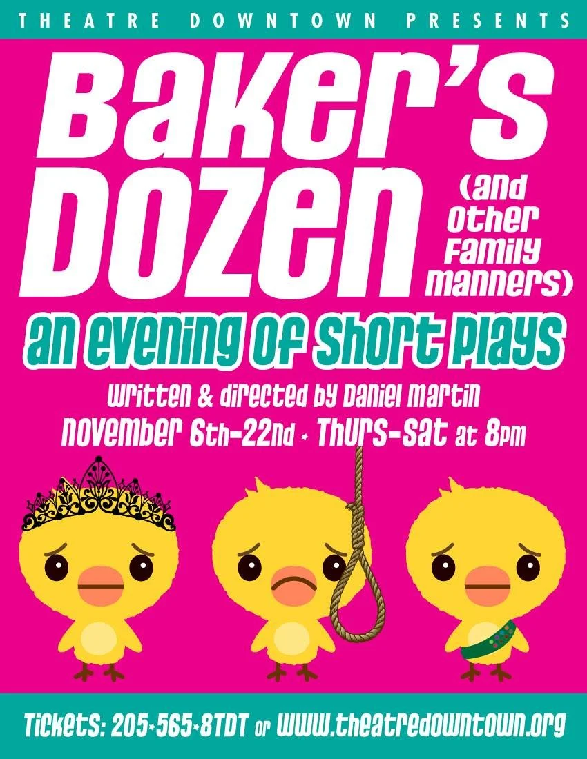 Three one act plays about the joys and sorrows of modern families...dead chickens, deformed children, and drag queens...it's a slice of life as only Theatre Downtown can serve it. In Baker's Dozen, two boys unsuspectingly find themselves raising a dozen chicks. Meanwhile, in Bag Boy, an awkward young girl makes a connection with a strange boy while trying to sell her last box of cookies. And, finally, in Pink Lemonade, two sweet church ladies prove that appearances can be deceiving when they entertain an unexpected guest for dinner.