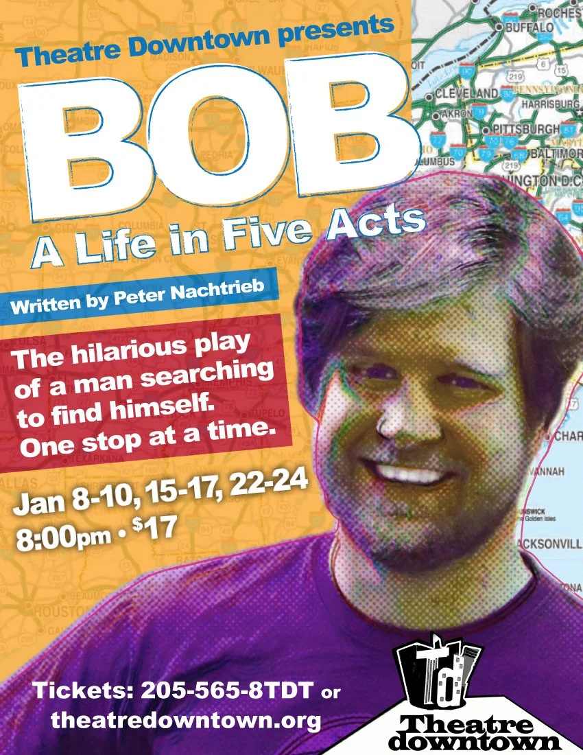 BOB chronicles the highly unusual life of Bob and his lifelong quest to become a “Great Man.” Born and abandoned in the bathroom of a fast food restaurant, Bob energetically embarks on an epic journey across America and encounters inspiring generosity, crushing hardships, blissful happiness, stunning coincidences, wrong turns, lucky breaks, true love and heartbreaking loss. Along the way, Bob meets a myriad of fellow countrymen all struggling to find their own place in the hullaballoo of it all. Will Bob’s real life ever be able to live up to his dream? BOB is a comedic exploration of American mythology and values, the treacherous pursuit of happiness, and discovering what it means to be truly “great."